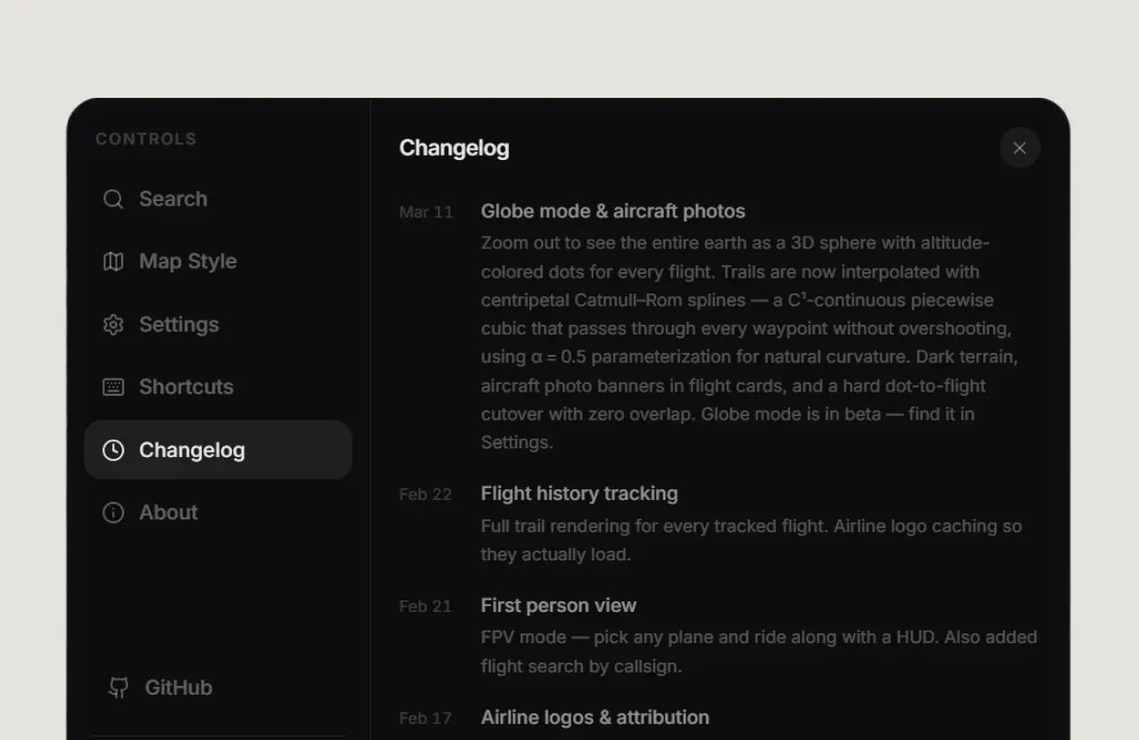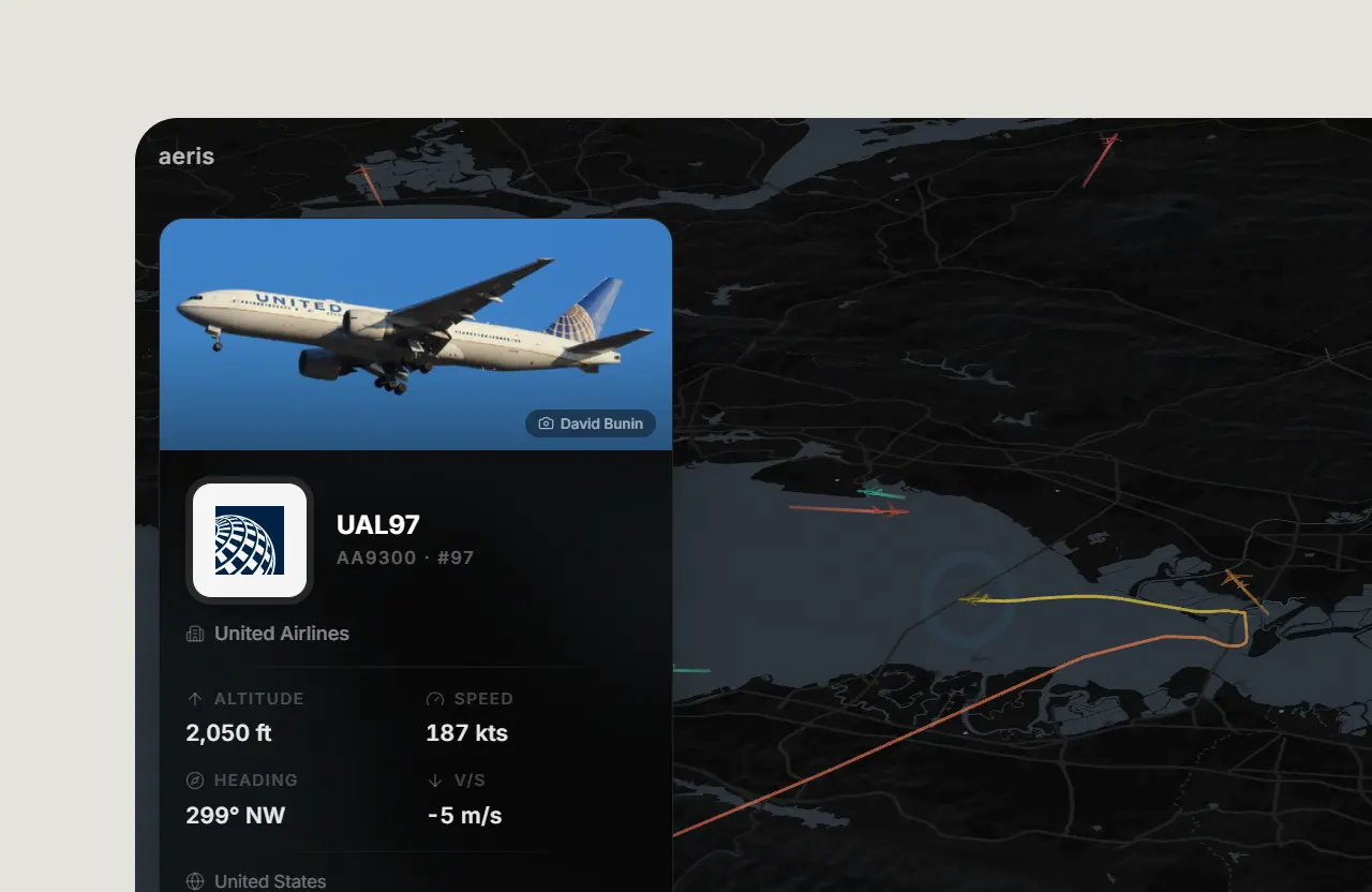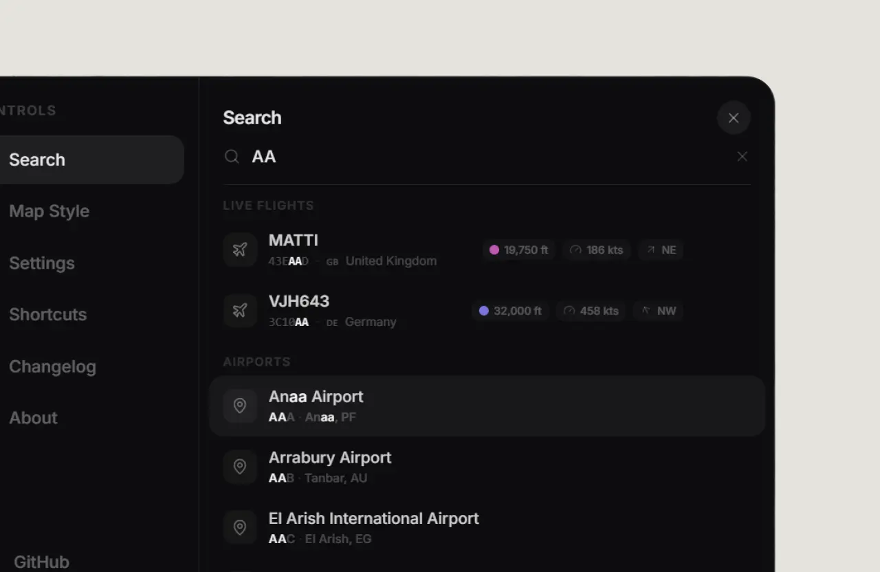 Real-time 3D flight tracking with altitude-aware visualisation over live airspaces.